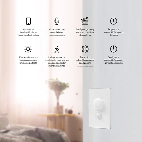 Controla y regula las luces de tu hogar desde el celular o con tu asistente de voz favorito. Incorpora un mecanismo de atenuación con botón giratorio, un sensor de movimiento y un sensor luz que te permitirán personalizar y automatizar la intensidad de luz en tu hogar.