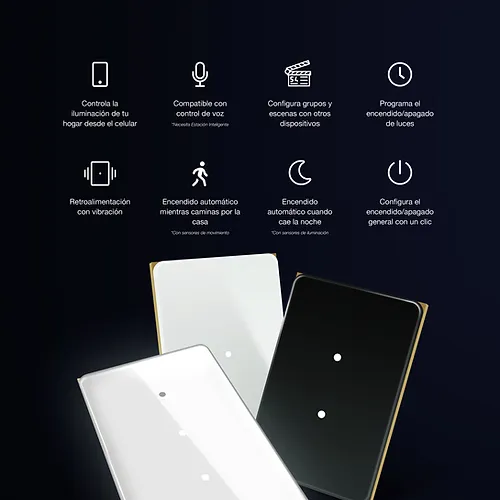 Controla las luces de tu hogar desde el celular o con tu asistente de voz favorito. El Interruptor Inteligente Moonstone cuenta con un panel de cristal 2.5D, que además resaltar por sus excelentes acabados y elegante diseño curvado en los bordes, proporciona retroalimentación al tacto con vibración 3D.